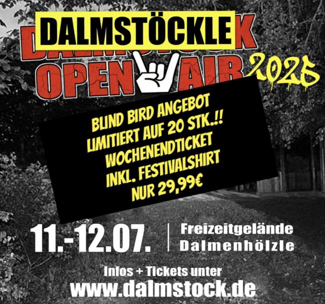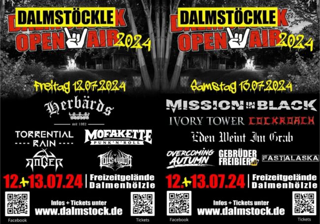 DALMSTÖCKLE OPEN AIR 2024 – diesmal mit Camping-Area! Ja, Ihr habt richtig gelesen, ZWEI TAGE!! Es ist uns gelungen direkt neben dem Dalmenhölzle einen Campingplatz anbieten zu können, um wieder 2 Tage mit Euch allen zu feiern!!! Am „Stöckle“-Wochenende lassen wir es krachen dass die Heide wackelt. Am Freitag ab 17:00 (Einlass) mit Tales Of…